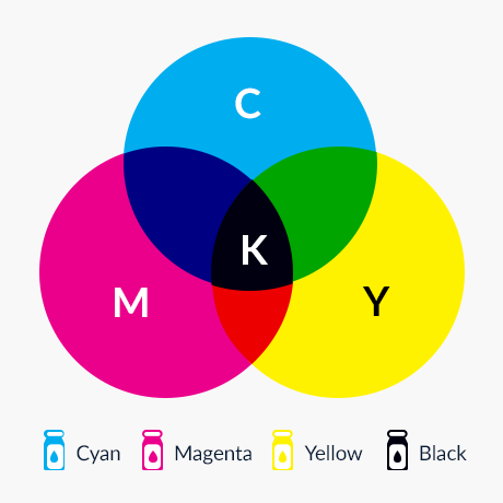 CMYK stands for the primary colors of cyan, magenta, yellow and key (or black), this is the four-color model typically used for printing, achieved by mixing the colors together.