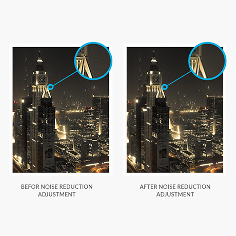 Noise reduction involves the removal of artifacts in a digital image usually by increasing the available light in a scene.
