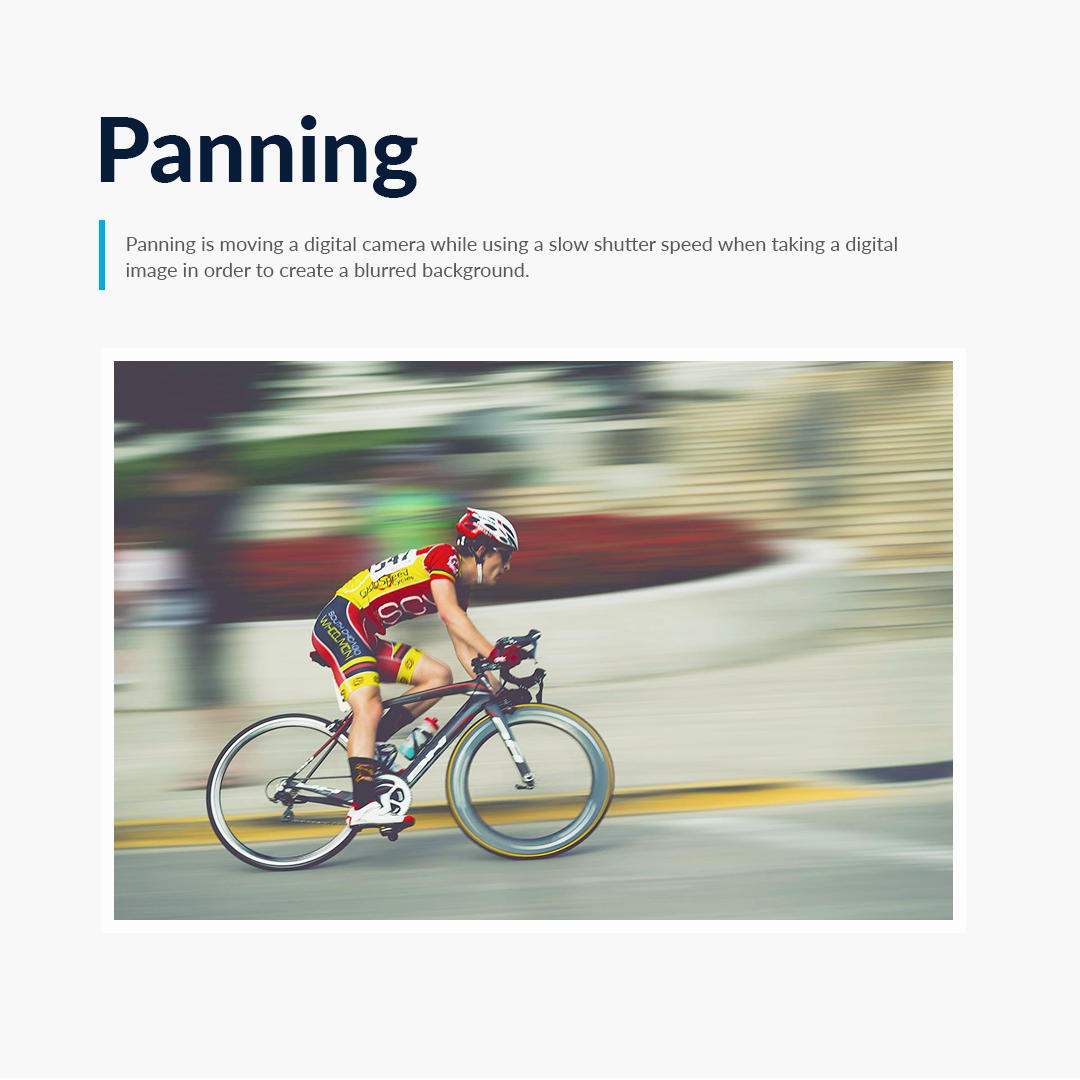 Panning is moving a digital camera while using a slow shutter speed when taking a digital image in order to create a blurred background.